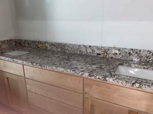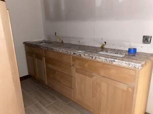 On Wednesday, the granite crew came back out and cut the vanity backsplash and got it installed. It looks good.