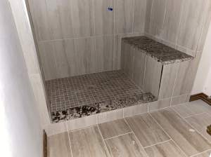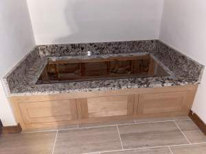Monday started with the vanity top getting installed. The sinks got glued to the bottom of the granite. The shower curb top also finally got installed. That has the shower now ready to be measured for the glass. The backsplash around the tub platform was added as well.