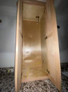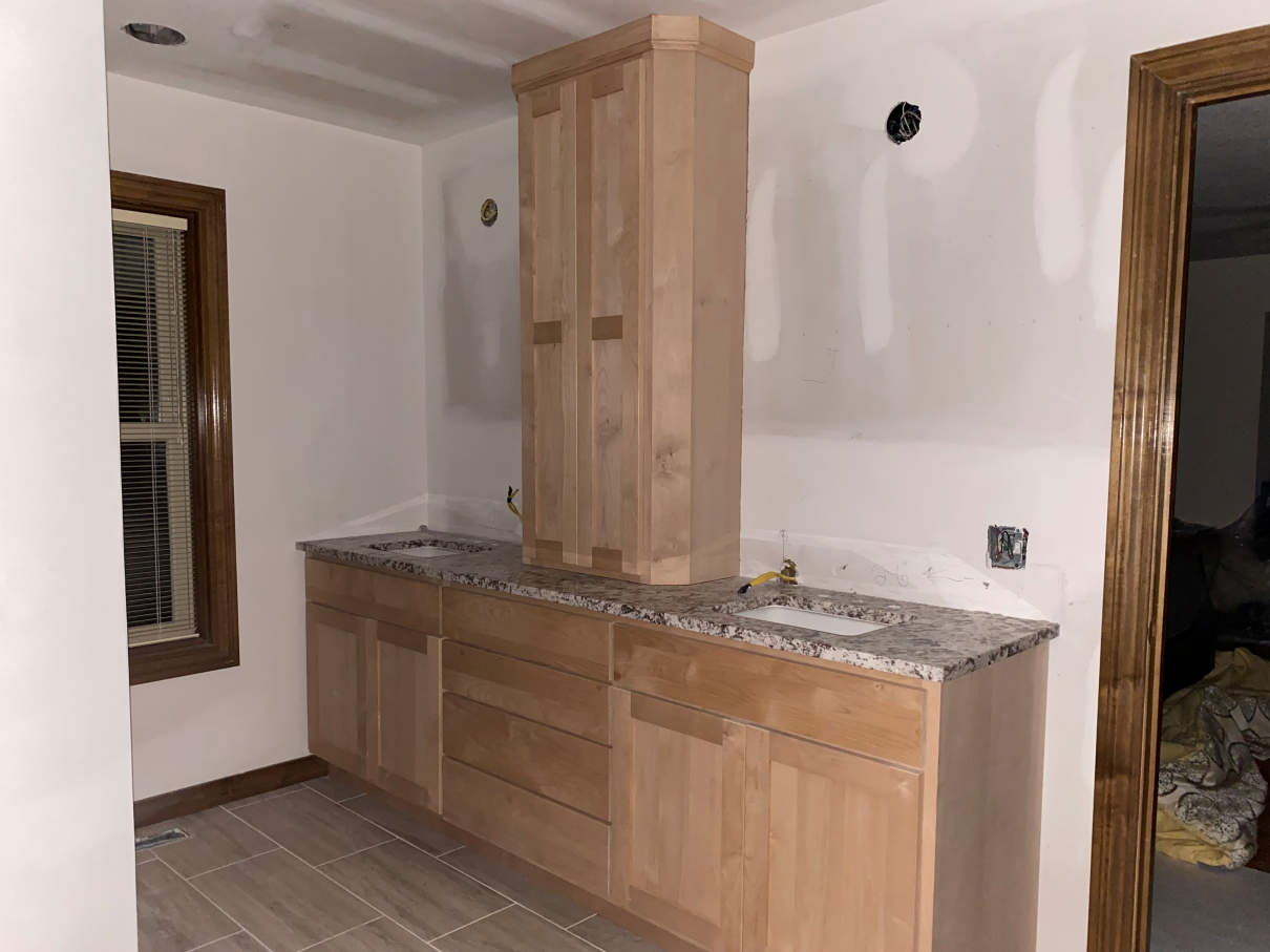 Tuesday the Buckingham Group came and installed the tall vanity cabinet. The sheetrock on the wall was cut out so that the cabinet could be recessed about 4 inches. That gives us more counter space and still have a full depth cabinet. They also added crown molding to the top of the tall cabinet and also the top of the cabinet over the toilet.