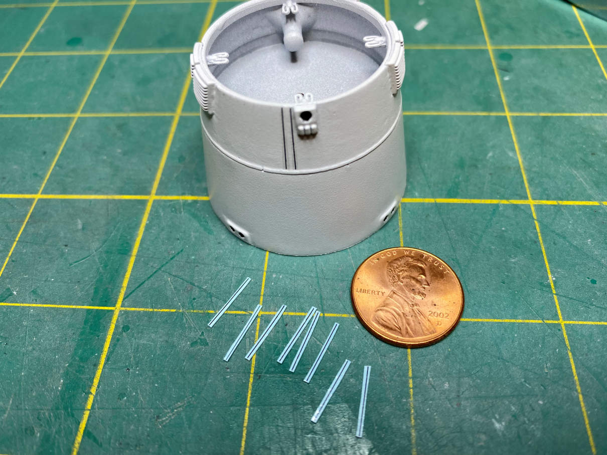 I made a circle about the same diameter as the front of the retro section and then put in 72 radial lines that extend past the diameter circle. This way I can place the part in the circle and then make tiny light pencil marks at the location where the stripe is supposed to go. If I had been smart I’d have not glued the two sections together until after I applied the decals so I could have had marks for both ends of the stripes. Oh well, planning?