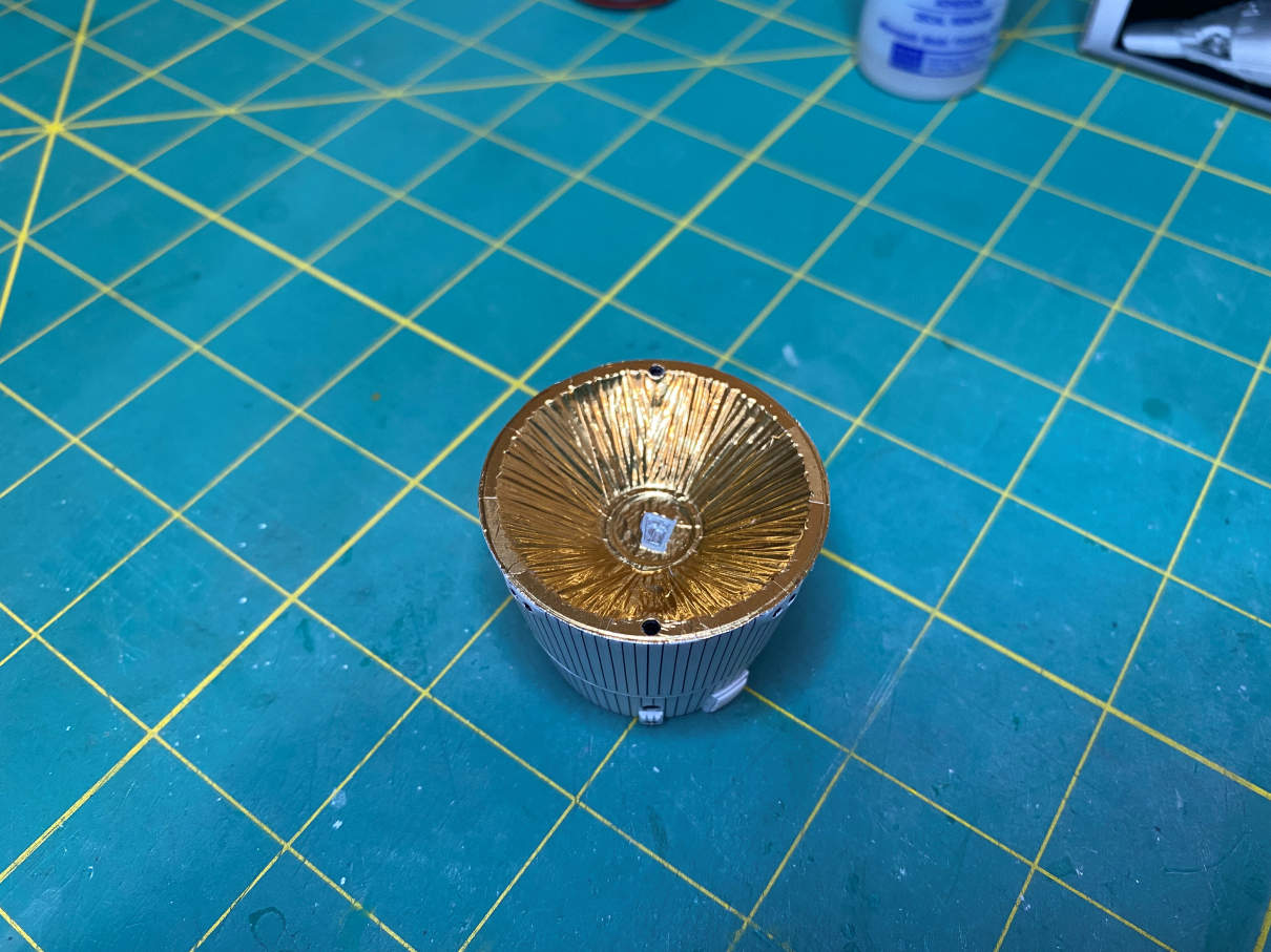 Finally, it was time to foil the back of the equipment adapter section. I started by painting the center detail with Testors MM Chrome Silver. I then cut wedges of Bare Metal Gold Foil and applied them overlapping each one slightly. The last section ended up being just a narrow rectangular piece to fill in the last remaining gap. I cut out for the two forward translation thrusters. Then I cut a small circle of foil to fill in the bottom and cut out for the silver section. Here is a photo of the completed part.