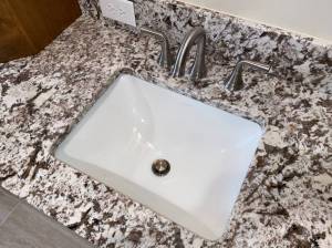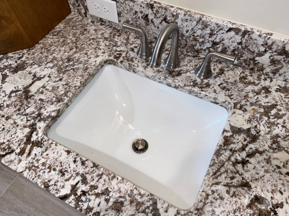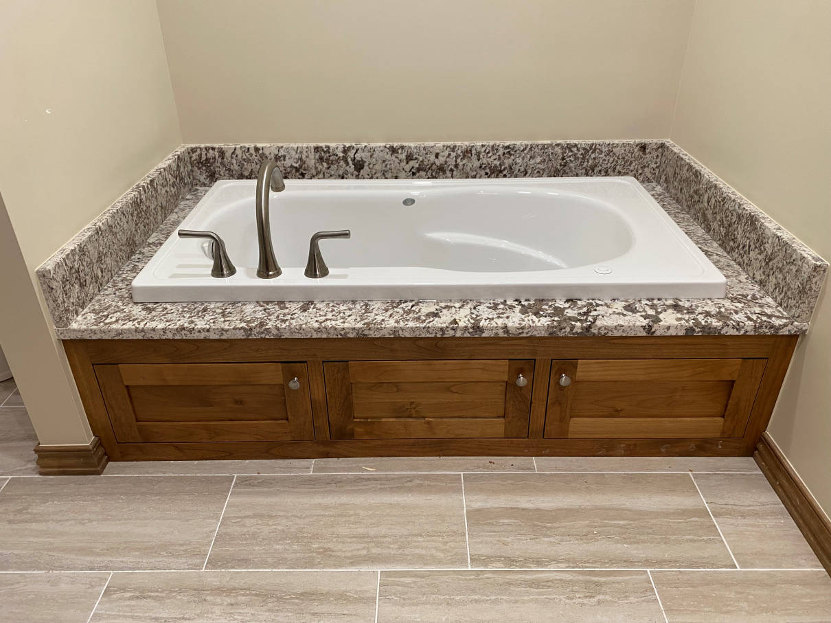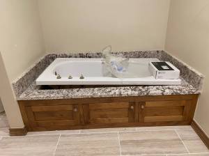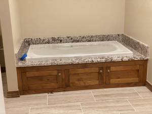 We then found out that the tub fixtures can’t go in the corner where we would have preferred because a structural brace for the tub is in the way. We decided to move the fixtures to the near side of the tub. The next tub problem occurred during the install of the tub drain. The hole in the floor is not large enough to accommodate the drain. He would have to come back the next day with a helper to enlarge the drain hole in the floor.
