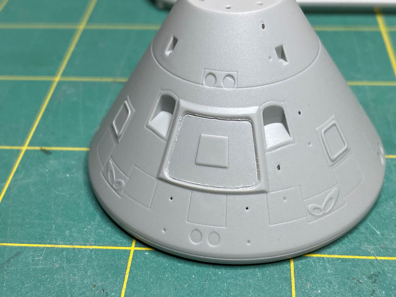 Well almost straight from the kit. You can see that I scribed the outline of the main hatch. The next thing I did was start sanding down the raised area which is much too pronounced. I also removed the raised area for the hatch window and the frames for the two side windows.