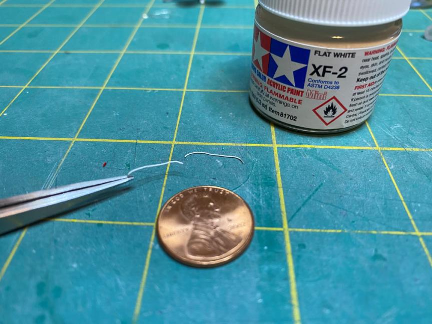 I then took some 32 gauge wire and cut some to the length needed bent them to run from the SM/SLA Electrical Umbilical Disconnect to the holes that I had previously drilled in the back of the Service Module. I then painted them Tamiya Flat White.