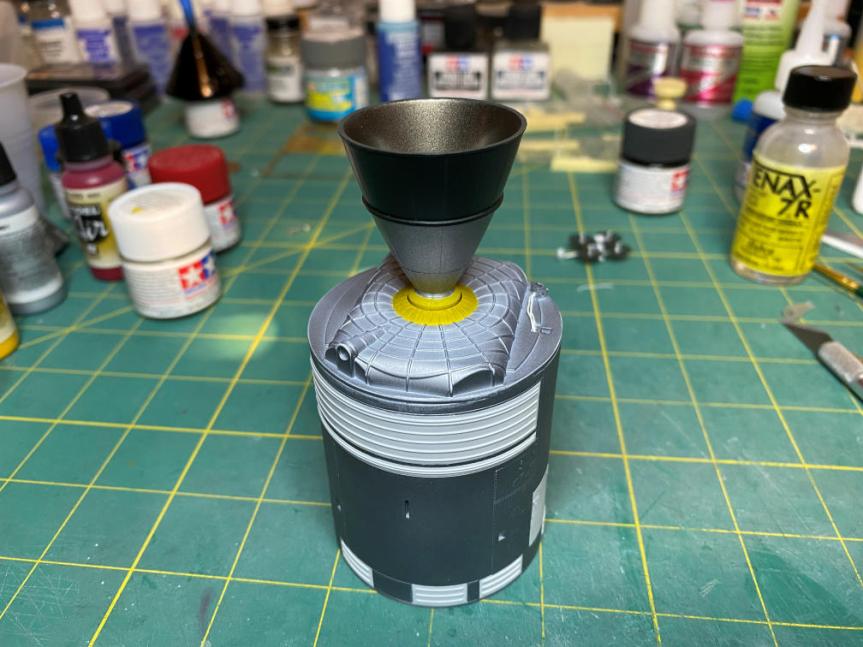 You can also see that I painted the SPS engine curtain yellow. I also finished painting the SPS engine nozzle. The bottom portion is NATO black and the upper section was painted Tamiya Metallic Gray.