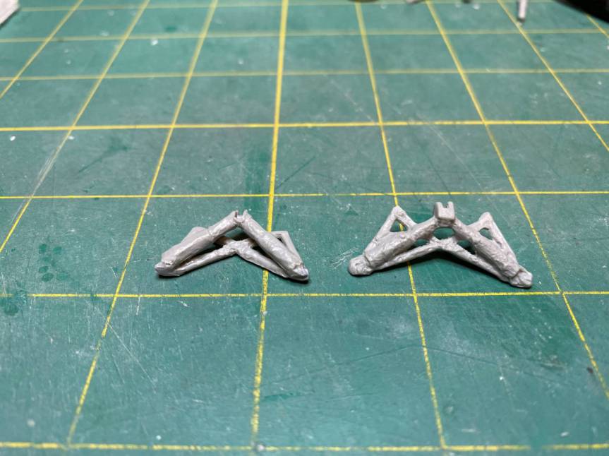 It’s time to get back to the LM. I finally decided what I was going to do with the folded landing gear. I took the deployed gear and cut them at the hinge line. I then did some mild shaping at the joint and glued the two sections together in a folded orientation. I then applied some putty at the joint to smooth things out a bit. The picture shows the spliced gear and the folded gear from the kit.