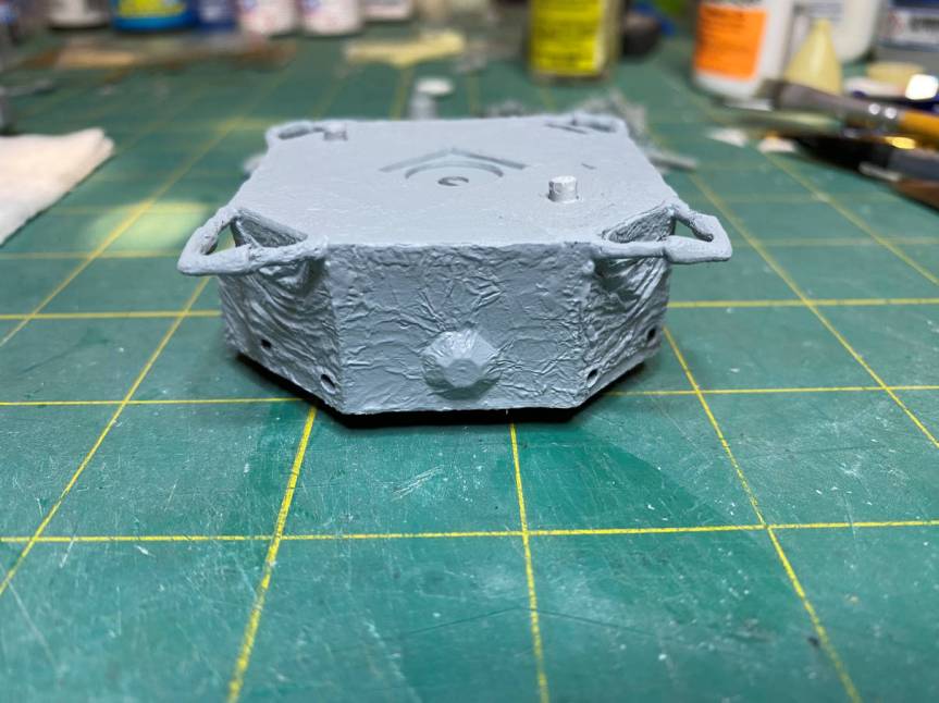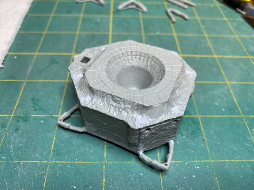 Mr. Surfacer 500 Putty was liberally applied in several layers to better blend them in. I also trimmed off the excess that is raised above the top of the Descent Stage.