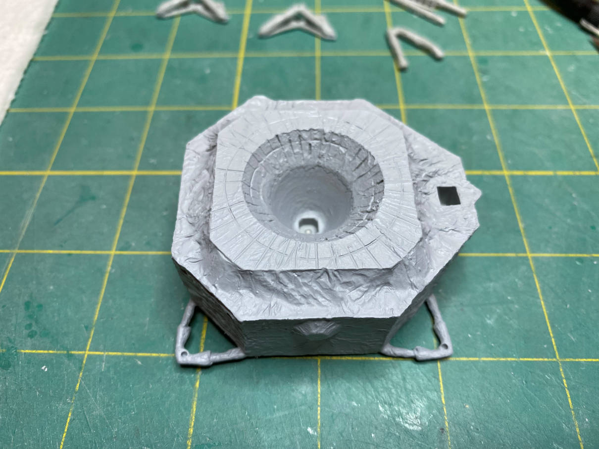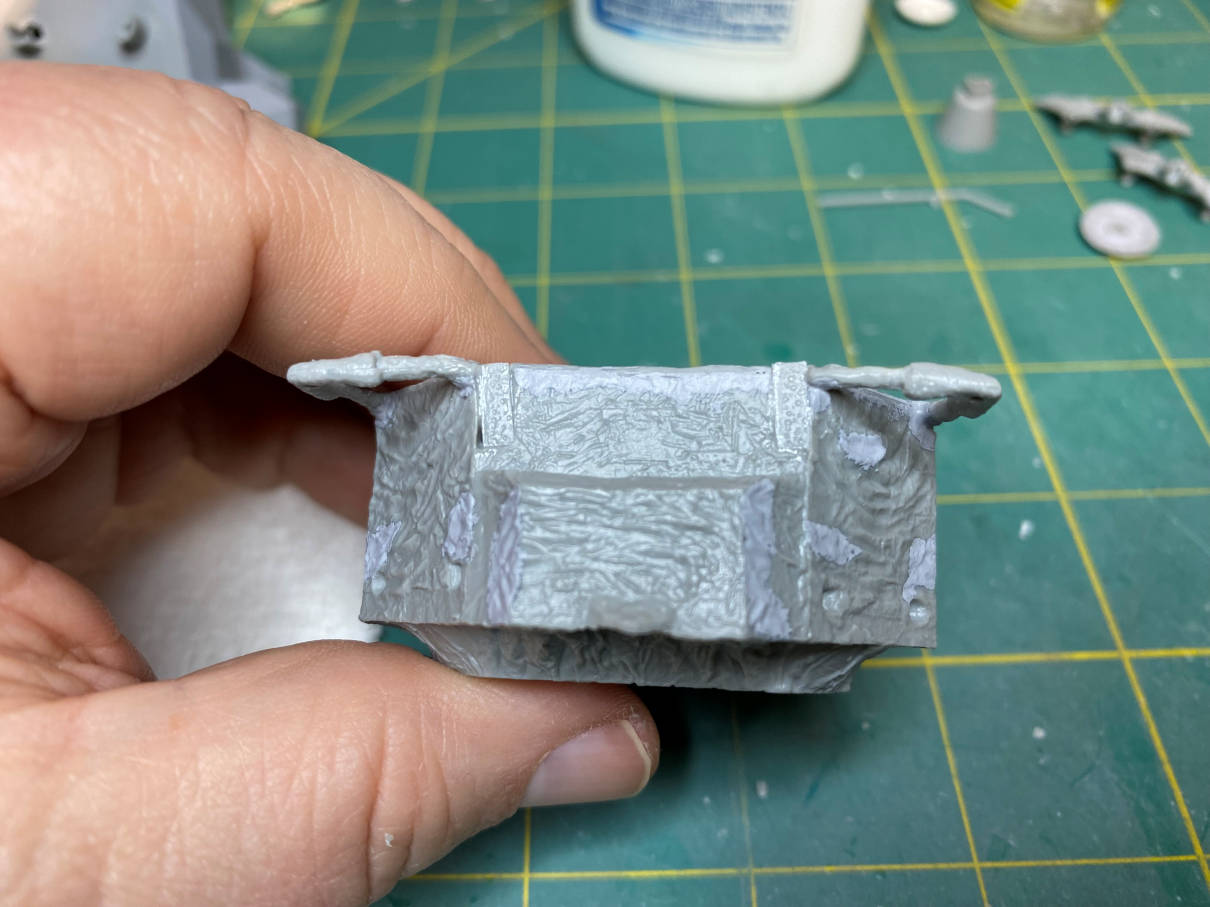 Mr. Surfacer 500 Putty was liberally applied in several layers to better blend them in. I also trimmed off the excess that is raised above the top of the Descent Stage.