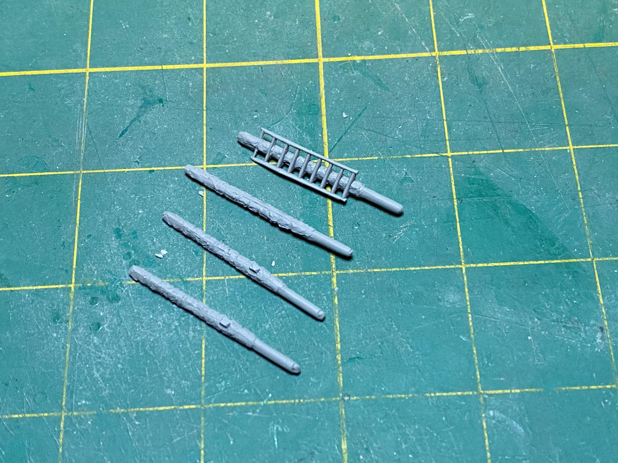 I finished the legs by sanding off the molded in foil on the lower section of the leg since Apollo 10 didn’t have any. I also cleaned up the ladder which had quite a bit of flash/off register mold lines. I also sprayed them with primer.