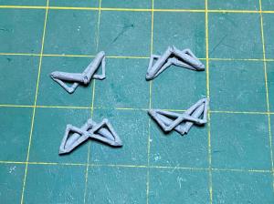 So, I got back to work on the landing gear for the LM. I finished folding the gear sections and did a bit of trimming and applying putty. Then they got a coat of primer. They aren’t exactly scale, but they do look better than the pre-folded part provided in the kit.