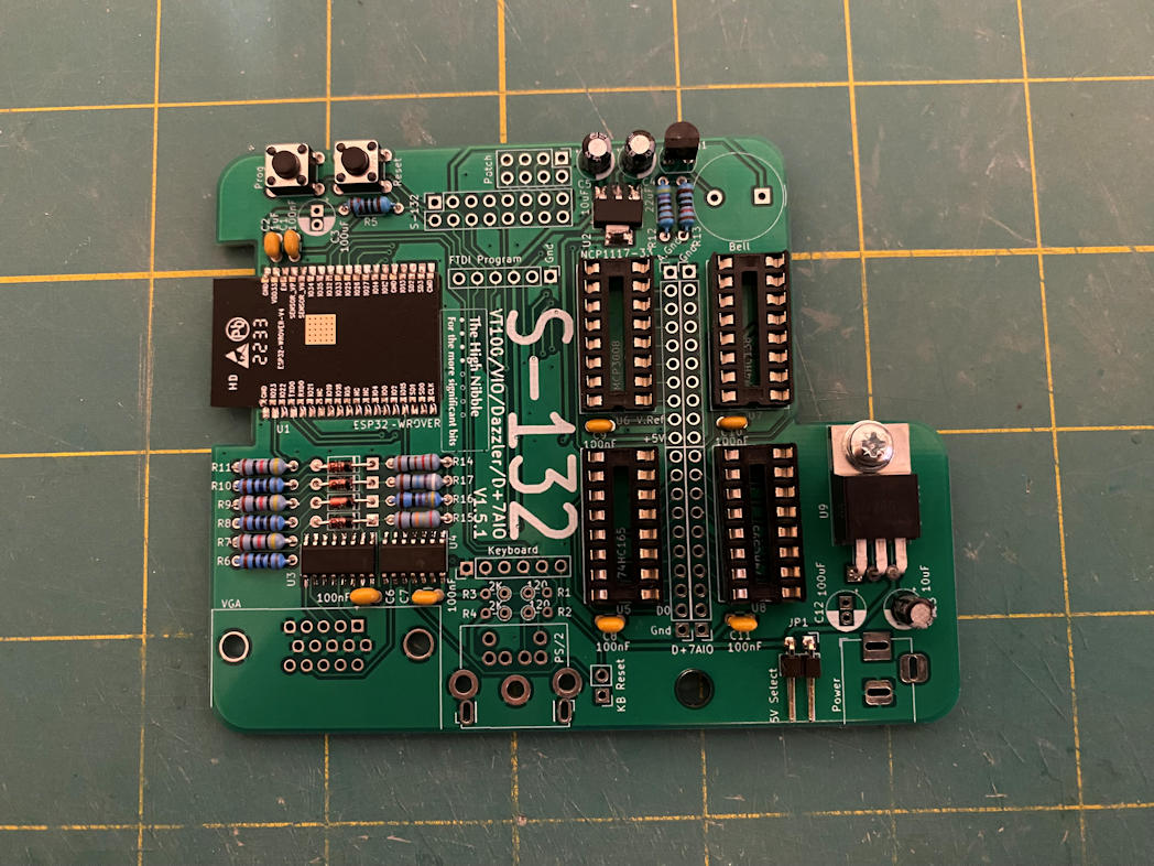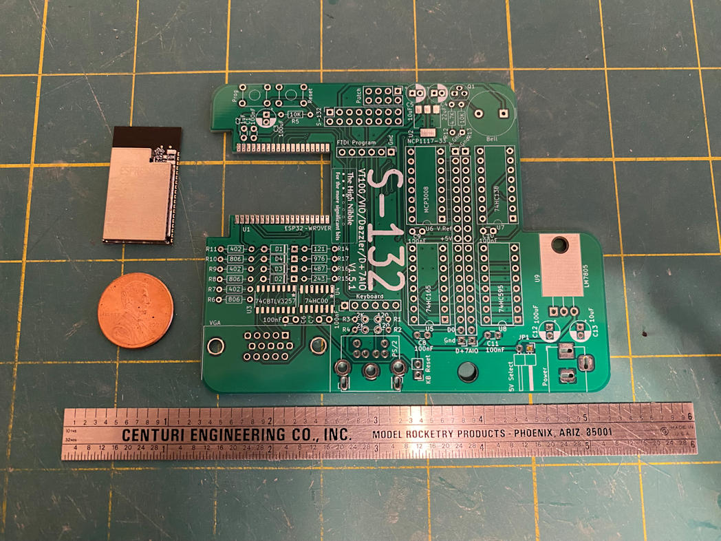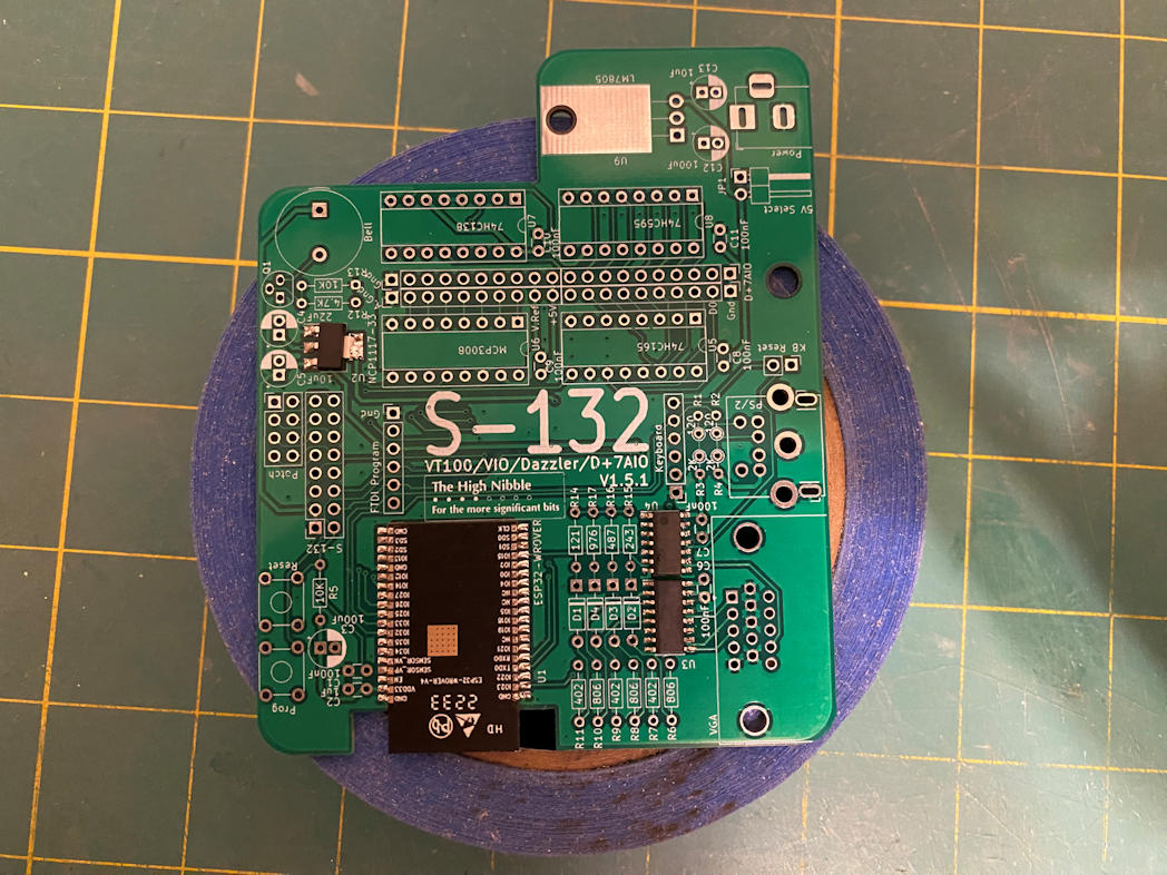Here is the S-132 kit from The High Nibble. It adds many features that were provided on the real IMSAI 8080 by add-in S-100 cards. It provides output to a VGA monitor and supports either a PS/2 or USB-HID keyboard for input. You have to choose one or the other the board does not support both. I ordered my S-132 with the USB-HID port. The device simulation is done via an onboard ESP-32. This is in addition to the ESP-32 that runs the IMSAI 8080 emulator. It connects to the IMSAI 8080 clone via the patch header that is provided. Here is a picture of the S-132 board.