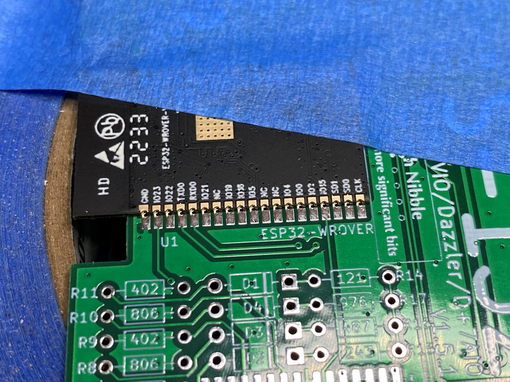 For me it was a bit stressful but visibly successful attempt. I won’t know if I got it right until it’s all done and I power it up. Next I soldered in the remaining three surface mount components. I placed the board on a roll of painters tape so I had a stable surface. The ESP-32 has a heat spreader on the other side that extends beyond the board and would make the board tip one way or another while I was trying to solder on the other components. This made the board stable during soldering.
