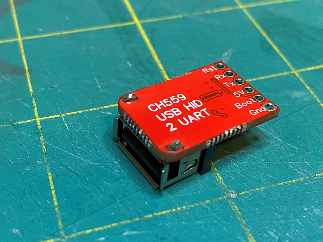 Now all that was left were the USB-HID miniboard, headers, large capacitors, barrel jack, and VGA port. I started with the USB-HID miniboard. It was meant for it to sit flat against the main S-132 board. The mini board has an IC on it that would have been a nightmare to solder, but fortunately this mini board is pre-soldered. The only problem was that the two pins that hold the USB socket in place had been soldered with an abundance of solder. This prevented me from getting a good flat join. I use some solder wick and remove a lot of the excess, but it still stands up just a bit. I did apply a good amount of solder from the back side of the S-132 to get a firm attachment to the board. It should work.