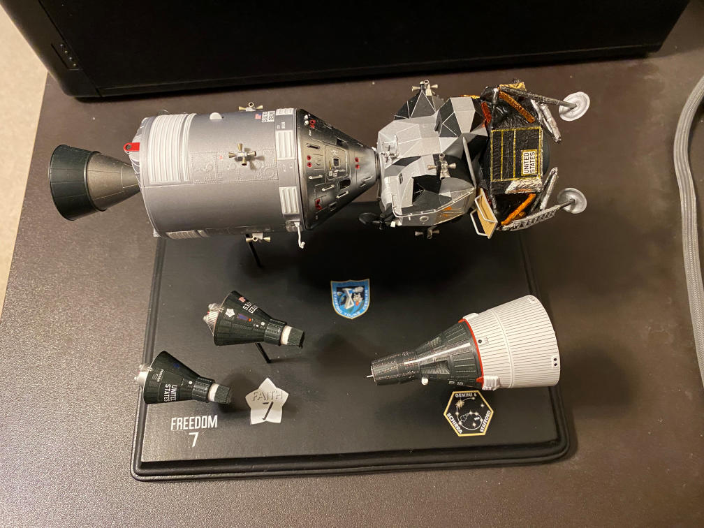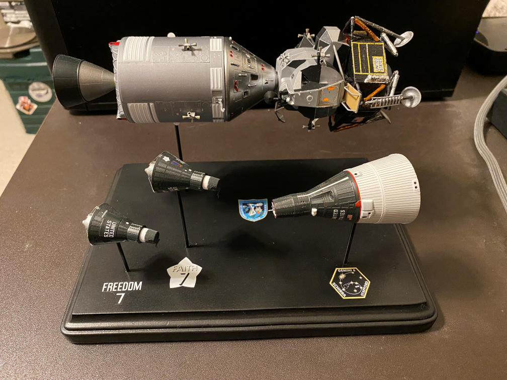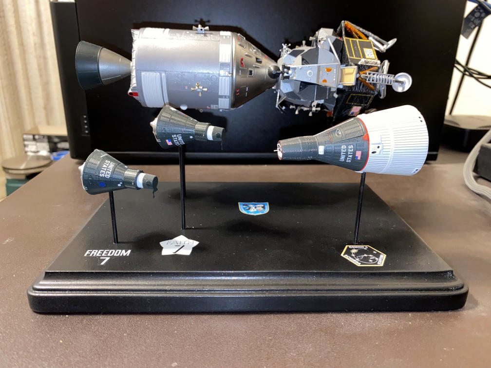 I finally got around to finishing the the mount for the Apollo 10 spacecraft. I combined them with my Horizon Models 1/72 Mercury (Freedom 7 and Faith 7) spacecraft and the Dragon 1/72 Gemini (Gemini 6) spacecraft. I created some custom decals for each spacecraft and mounted them together on a wooden base that I painted flat black. Here are some shots from different angles.