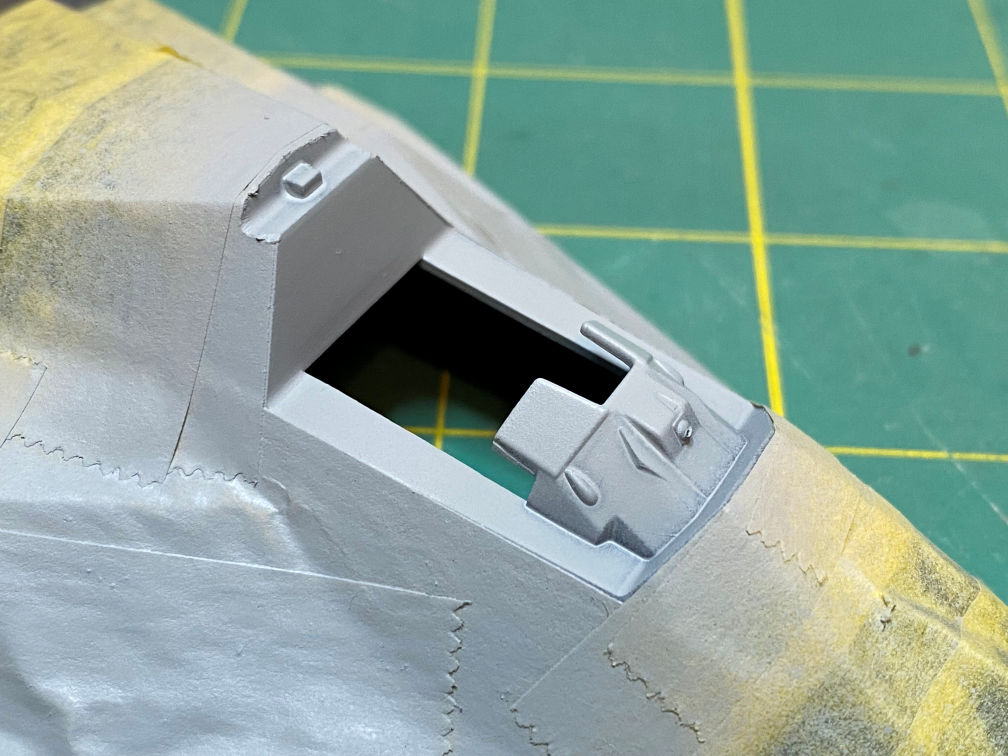 The build continues. I masked off the cockpit area of the upper fuselage and then sprayed it with primer.