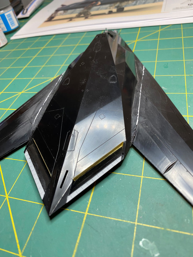 For the gap on the right, I applied Mr. Surfacer 500. The left gap was larger and I filled it with some styrene strip glued into place. You might also note in the above photo that I have glued the wings in place.