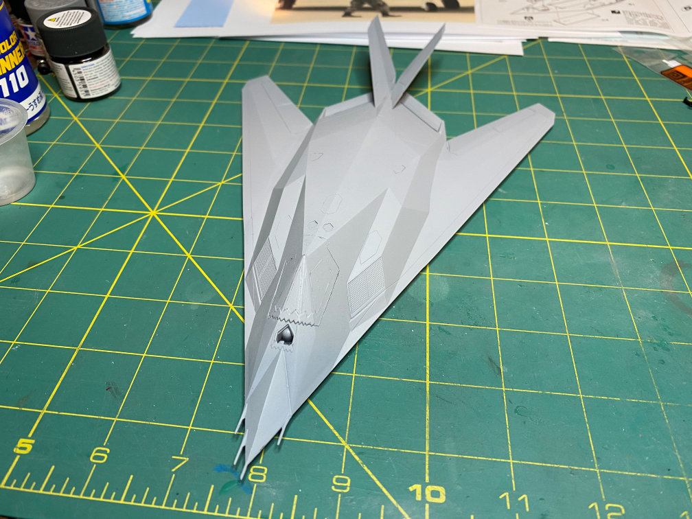 I put the tail parts on and then sprayed it with primer. That showed up some areas that needed a bit more filling and/or sanding.