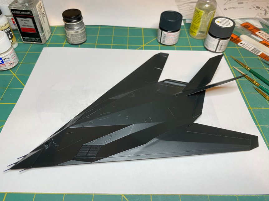 Things are moving along well with the F-117. The landing gear bays need to be white. So I used a combination of paper and masking tape to mask off the bottom. I then sprayed the bays white. It took a few coats to make sure that the entire bay was covered.
