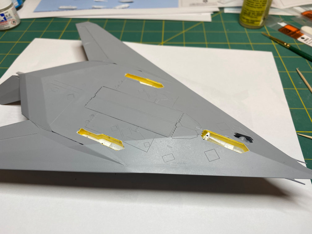 Things are moving along well with the F-117. The landing gear bays need to be white. So I used a combination of paper and masking tape to mask off the bottom. I then sprayed the bays white. It took a few coats to make sure that the entire bay was covered.