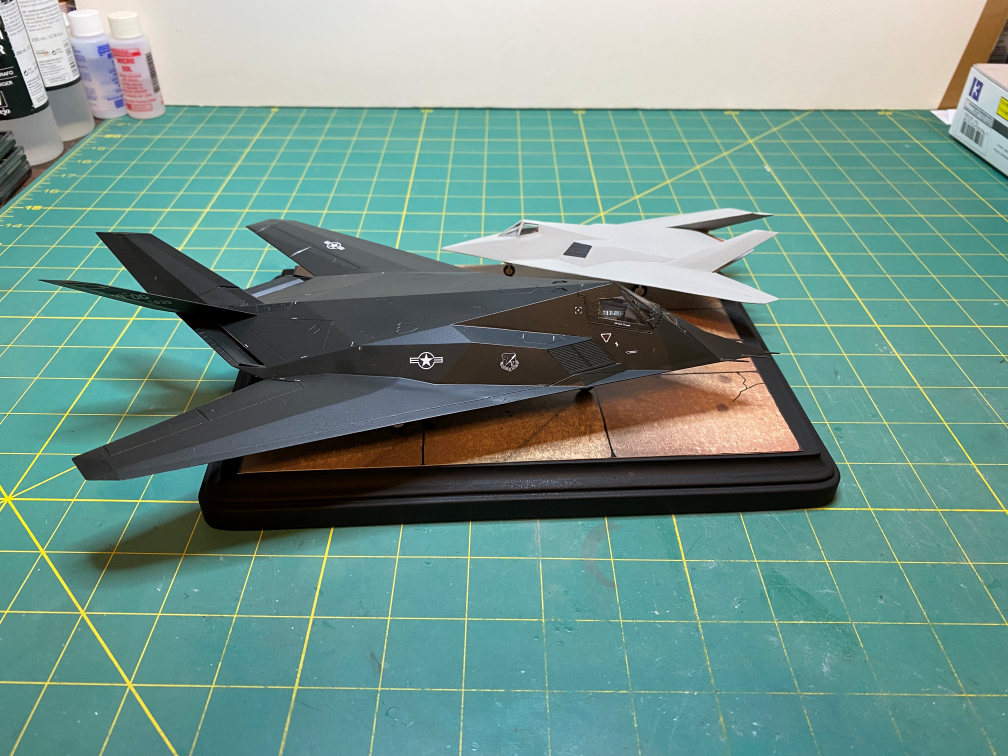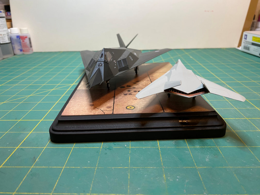 For the mount I used a wooden base painted flat black. I had an old Verlinden tarmac section that had been in my stash closet for years. I’m not sure they are still in business. It was pretty expensive for a piece of printed cardboard. This would be as good a time as any to use it. I trimmed it to fit the wooden base and placed the models on it. The XST “Have Blue” plane has a hole drilled in the bottom similar to what I did for the F-117 to keep it on the base. I don’t have the steel rods cut yet, but the planes are placed in the configuration I’m going to have them on the finished base.