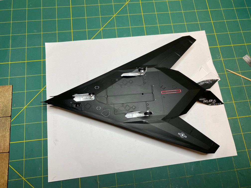 The final bit of assembly consisted of adding the landing gear and the landing gear bay doors. I glued the doors on with some Plasti-Zap CA glue. When those were cured I used Tenax to glue the landing gear in place. If you look closely at the bomb bay doors near the rear you will see a small hole I drilled. This is where a small section of steel wire will fit that will fix the model to the base so it doesn’t slide off.
