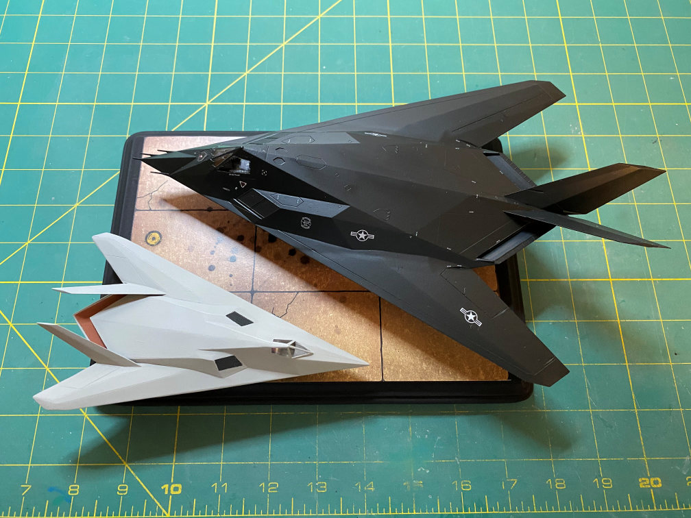 Now I finally have my two stealth planes finished and mounted. I built the F-117 pretty much out of the box. The only added details were the 3D-printed ejection seat and a set of aftermarket decals. The Hasegawa kit isn’t bad. The overall fit is good with the exception of the wing-body join. I’m glad it’s finally finished. It took much longer than I would have liked, but other things kind of got in the way.