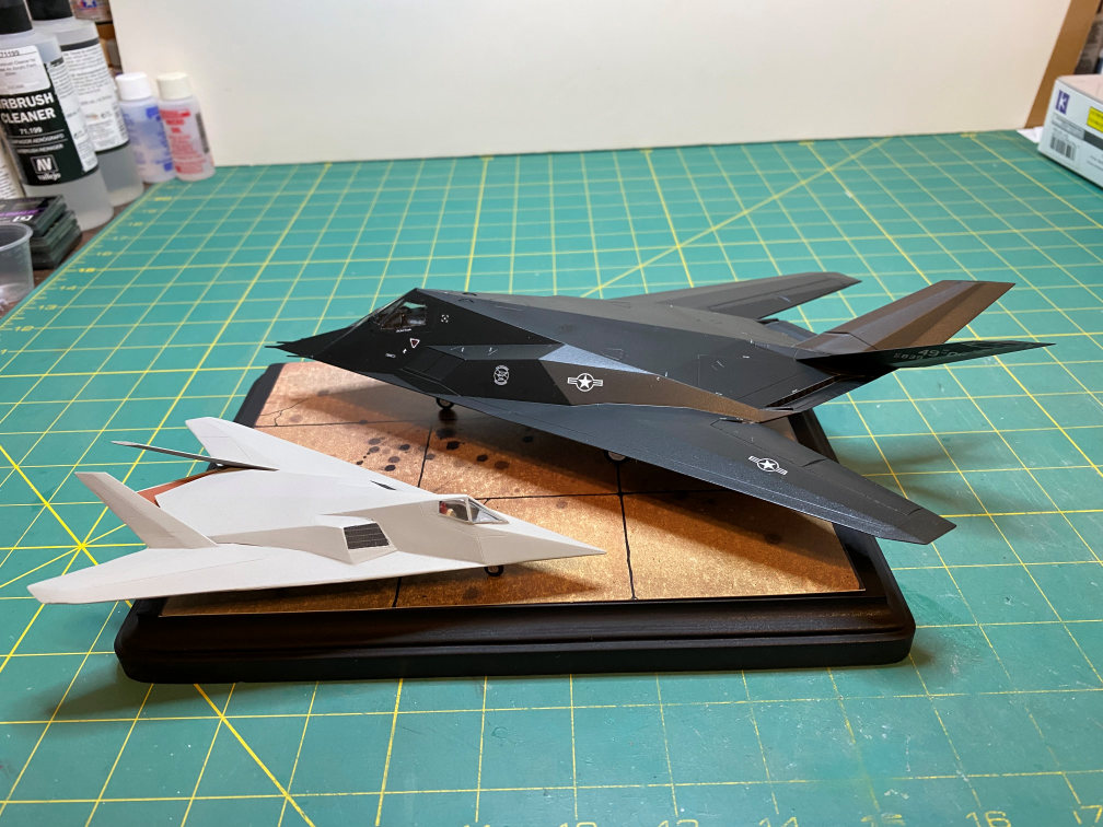 For the mount I used a wooden base painted flat black. I had an old Verlinden tarmac section that had been in my stash closet for years. I’m not sure they are still in business. It was pretty expensive for a piece of printed cardboard. This would be as good a time as any to use it. I trimmed it to fit the wooden base and placed the models on it. The XST “Have Blue” plane has a hole drilled in the bottom similar to what I did for the F-117 to keep it on the base. I don’t have the steel rods cut yet, but the planes are placed in the configuration I’m going to have them on the finished base.