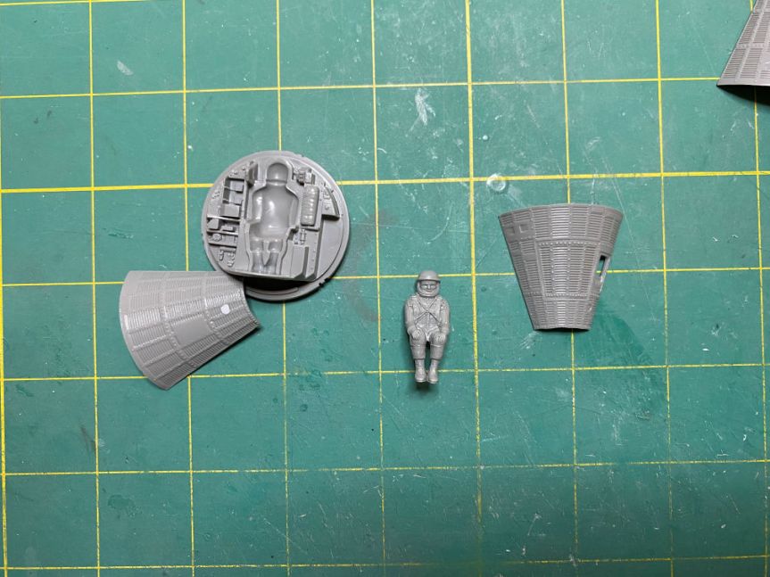 I then switched to the capsule. I started by gluing the hatch to its side of the capsule wall. I also started filling the hole in one side of the capsule wall. It is supposed to be where the mount would be attached. I won’t be using the mount so I filled the hole with Mr. Putty. The astronaut figure will be cleaned up (mostly mold lines) as well.
