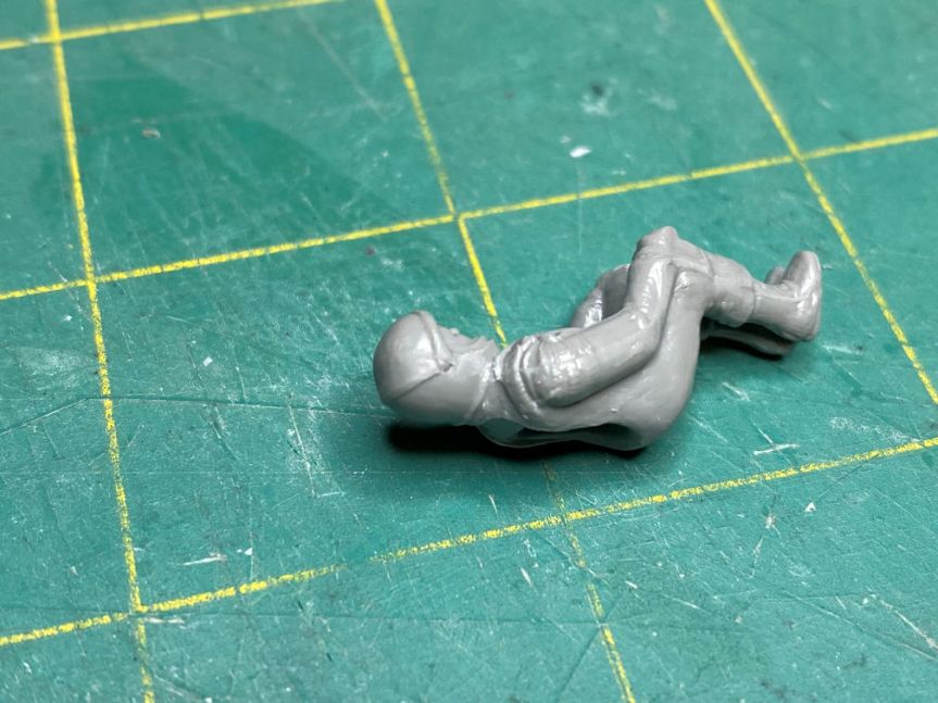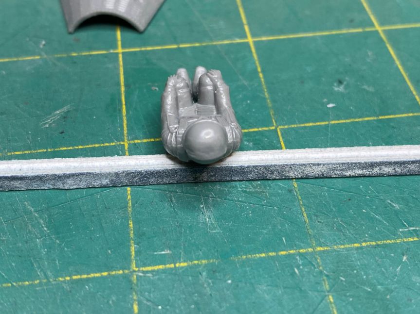It took a bit of work but I was able to get the mold lines off the figure. They were so heavy on the helmet that I didn’t realize that the figure is modeled as though his visor is up. Removing that line was about half of the clean up. I used several progressively finer sanding sticks to get a smooth surface again.