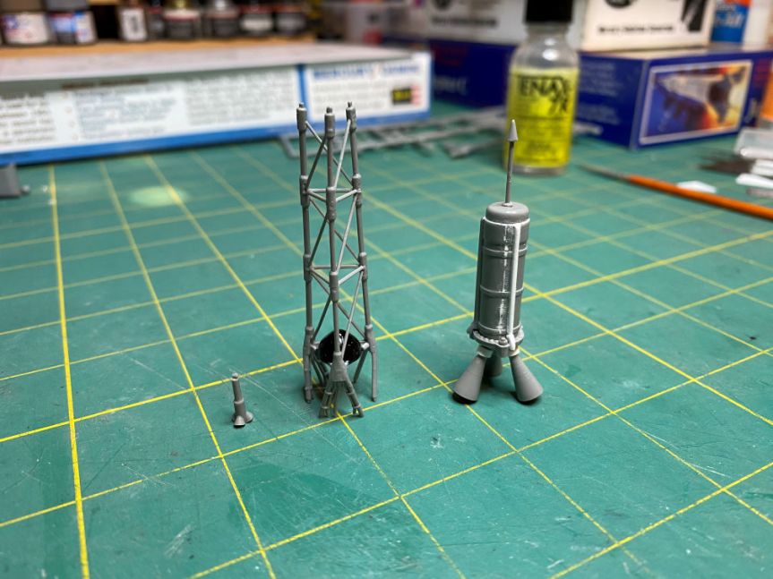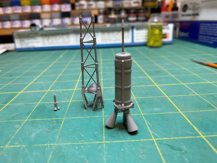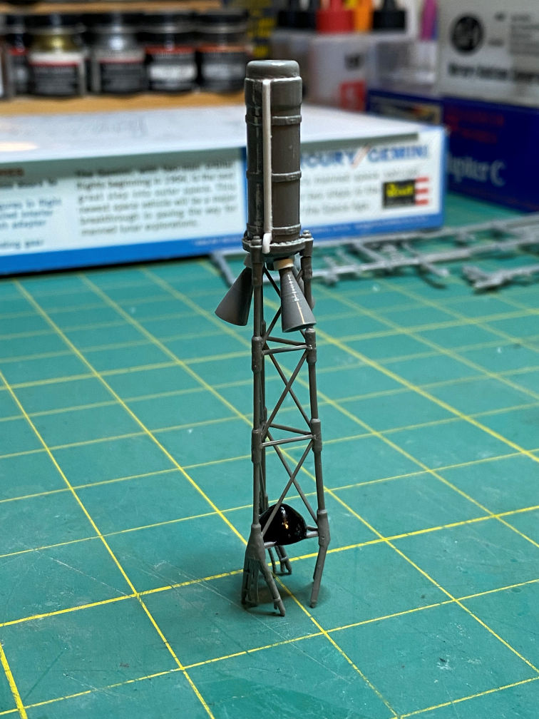I then glued the large nozzles to the rocket motor. I left off the small tower jettison motor. It will be added after the rest is painted red. I test fitted the rocket motor to the tower to be sure that everything was aligned properly.