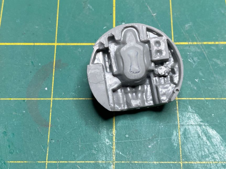 I can’t use the heat shield since the New-Ware part is flat on the spacecraft end. However, I do need the extra thickness that the edge of the heat shield adds to the spacecraft. To fix that I roughly cut a circle from some .040 sheet stock. The cabin back/astronaut couch is proud of the edge so I needed to sand away the excess on the back side. Here you can see it sitting flat on the sheet stock.