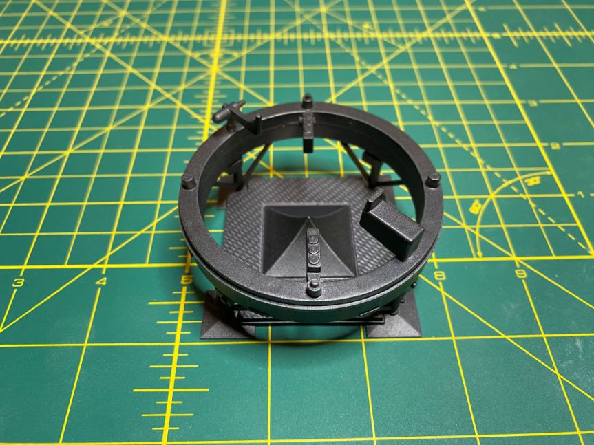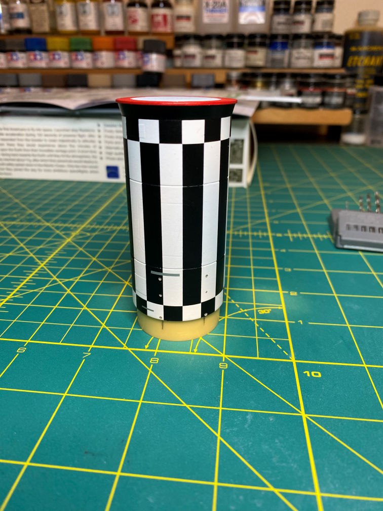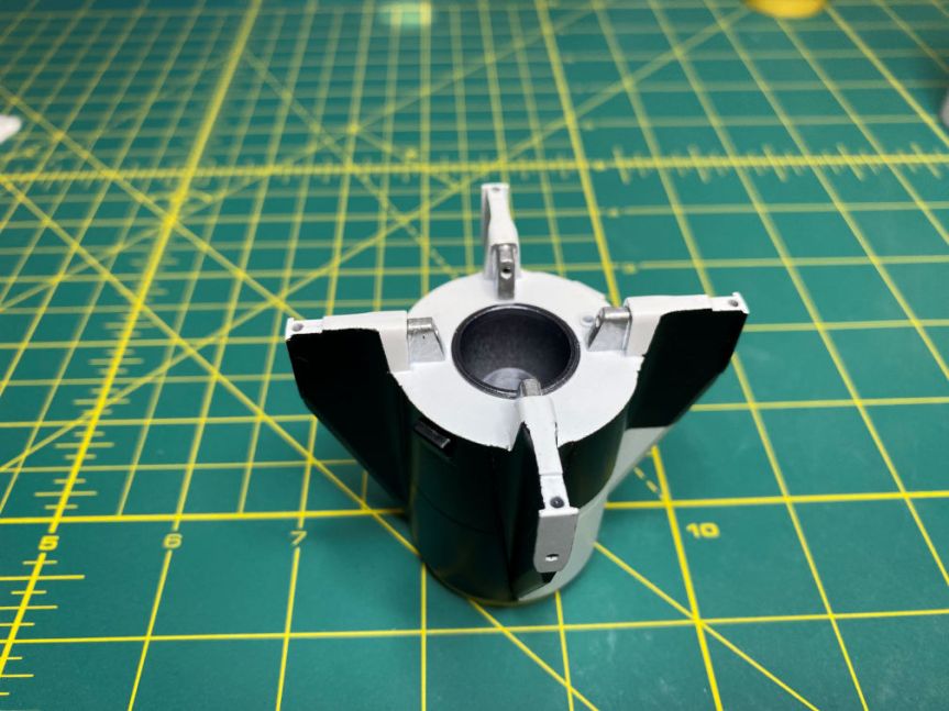 The other parts were painted with a few coats of Tamiya white primer. The propulsion section was then masked and painted with Tamiya TS-14 Black. The instrument section was masked and the adapter part was painted with TS-14 Black and the top ring was painted with Vallejo 71.003 Red RLM23.