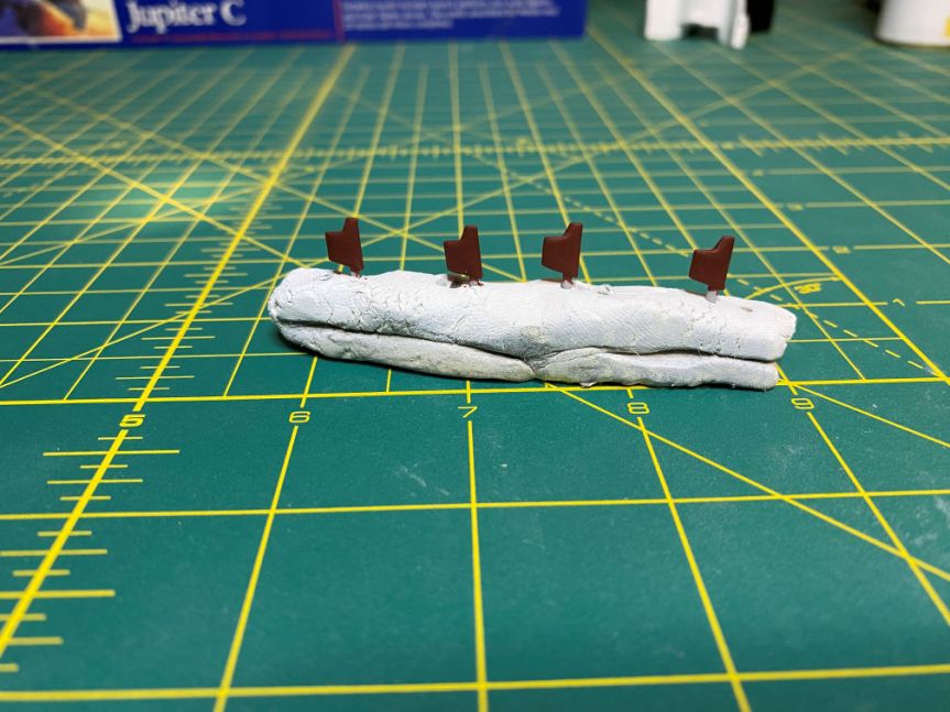 I’m still not completely happy with the propellant section. There are still problems along the seam lines and lumps here and there can be seen with various lighting angles, but I had to finally admit defeat and move on. The only way to really do it right would be to remove all the detail on the tube and sand it down to a smooth round surface and then add back the raised weld lines with lengths of tiny round styrene rod. That was a bridge too far for me right now, so good enough is good enough. Time to move on with the build.