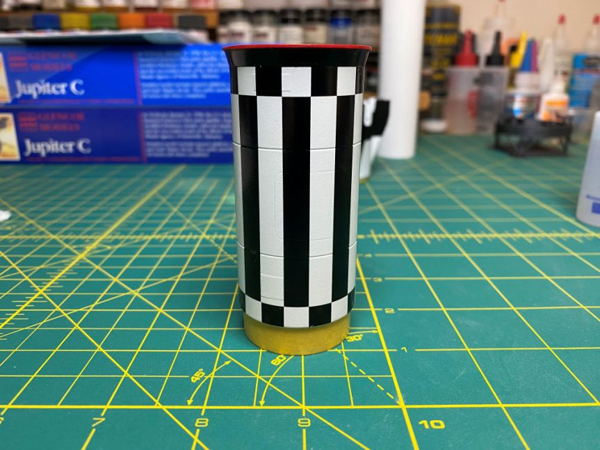 A couple of the details molded into the New-Ware instrument section were pretty deep and required several applications of Micro Sol and a couple of hits with Walther’s Solvaset. I also noticed that there was not as much overlap of the last section of decal as indicated by the Space Model Systems instructions. It appears that the diameter of the New-Ware instrument section is slightly larger than the diameter of the propellant section of the Glencoe kit. That leaves the last long vertical bar a bit wider than I would have liked, but it is what it is.