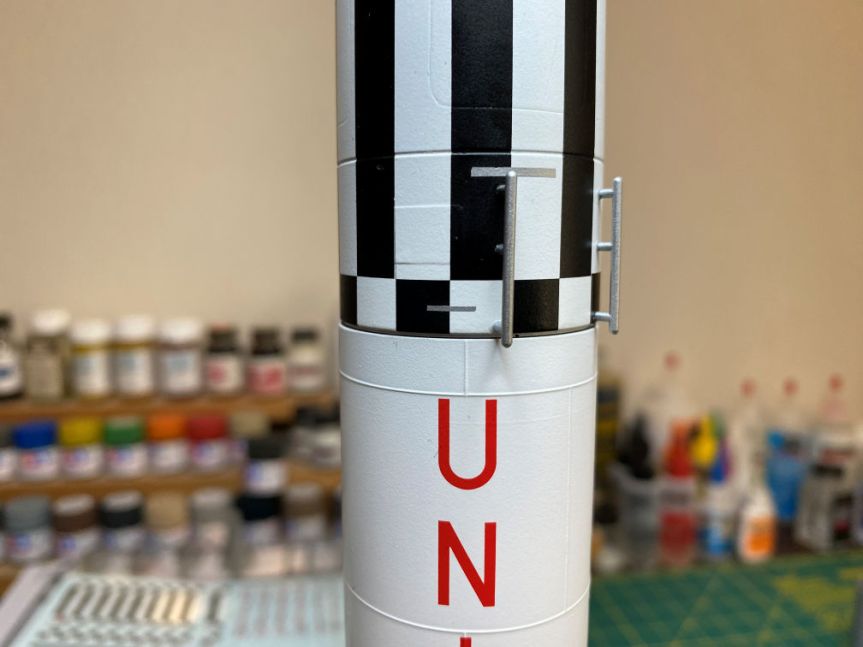 I then glued on the aerodynamic guide fins to the ends of the main fins and started applying the rest of the decals to the Redstone propellant section.