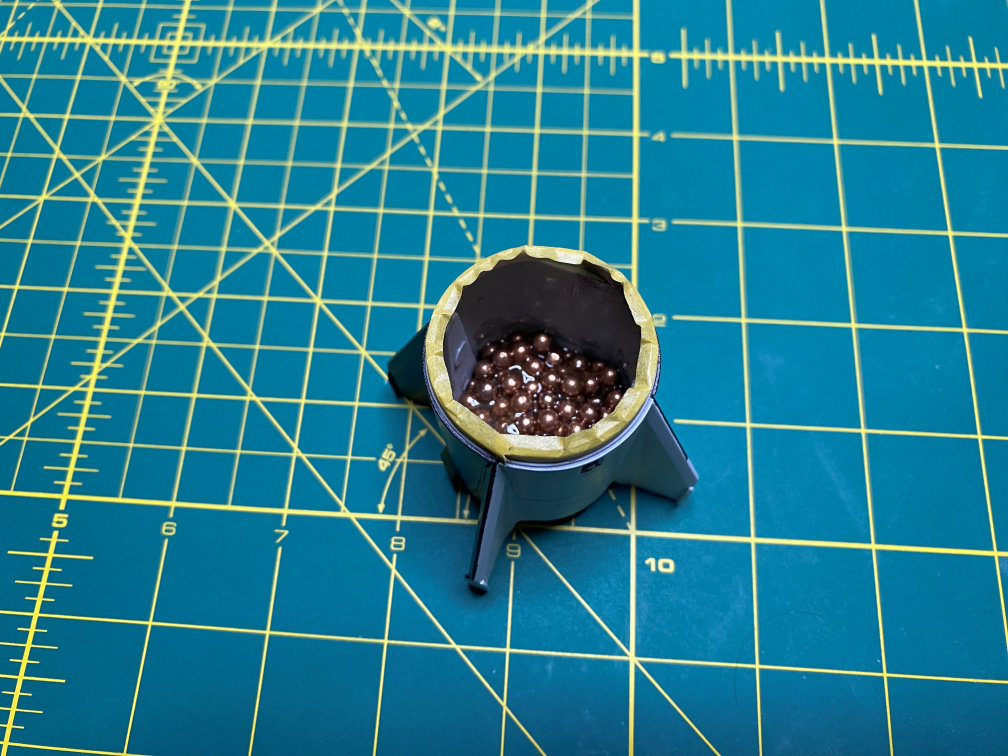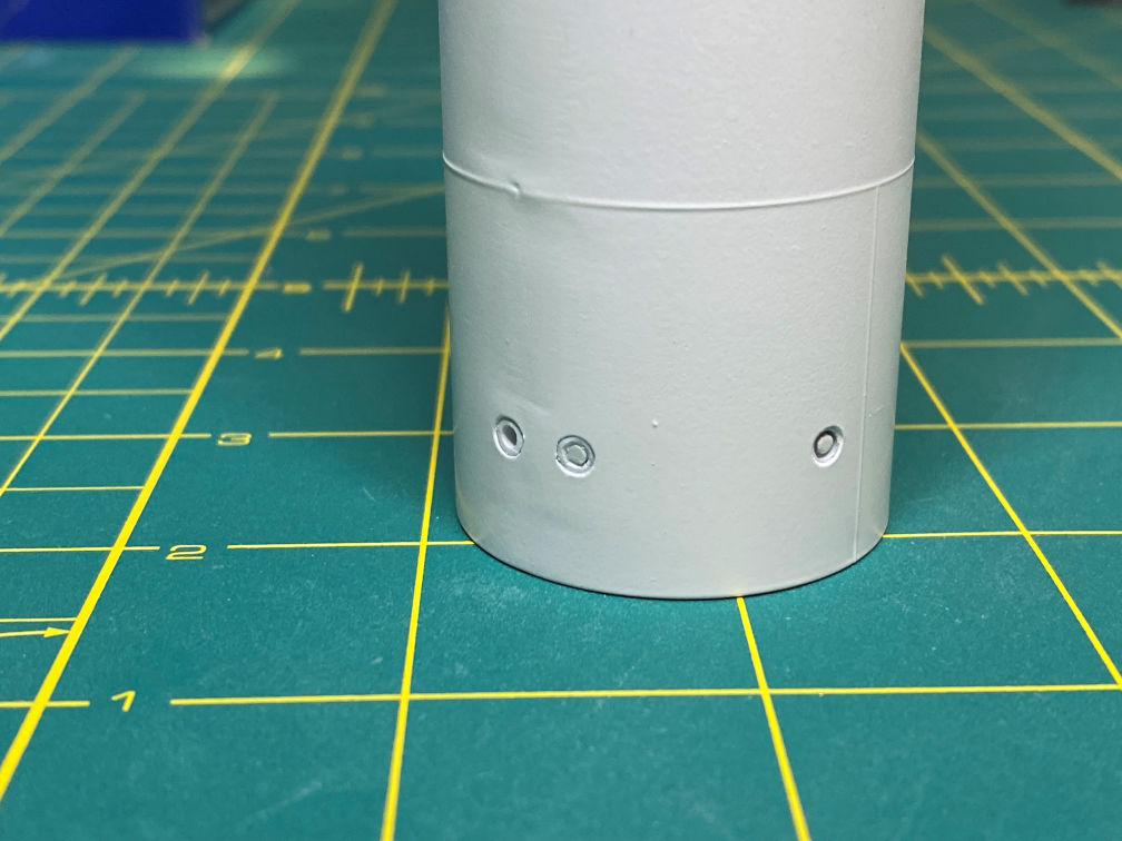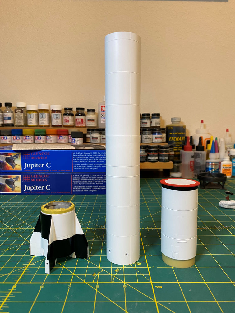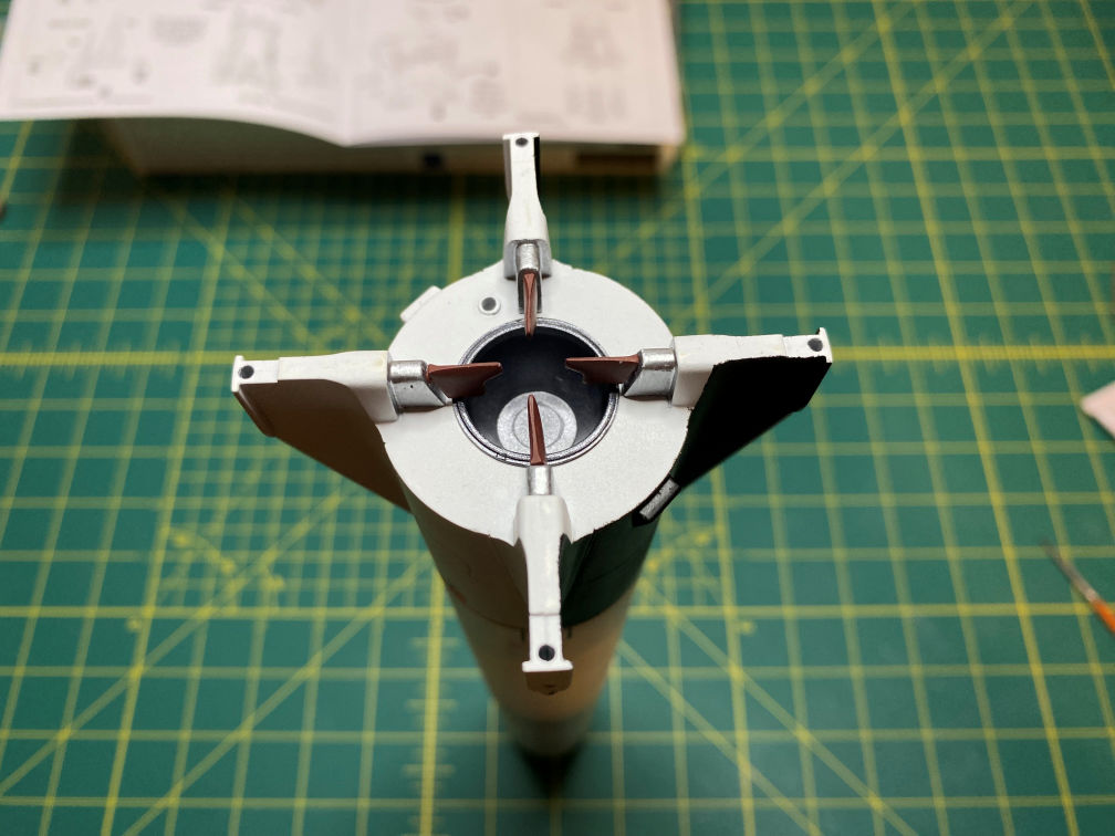I’m still not completely happy with the propellant section. There are still problems along the seam lines and lumps here and there can be seen with various lighting angles, but I had to finally admit defeat and move on. The only way to really do it right would be to remove all the detail on the tube and sand it down to a smooth round surface and then add back the raised weld lines with lengths of tiny round styrene rod. That was a bridge too far for me right now, so good enough is good enough. Time to move on with the build.