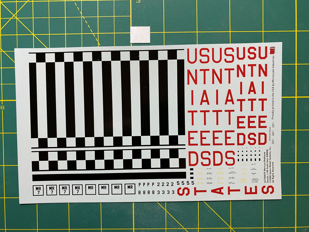 The parts that will need some decals were sprayed with some Tamiya Clear Gloss. I’m using the Space Model Systems 1/48 Redstone decals. Here is a shot of the decals. I won’t be using all the decals since some of them identify details that I did not add to the model.