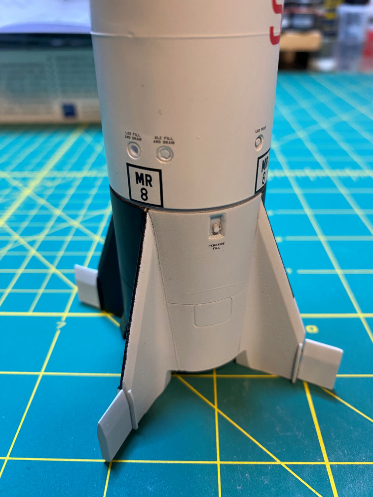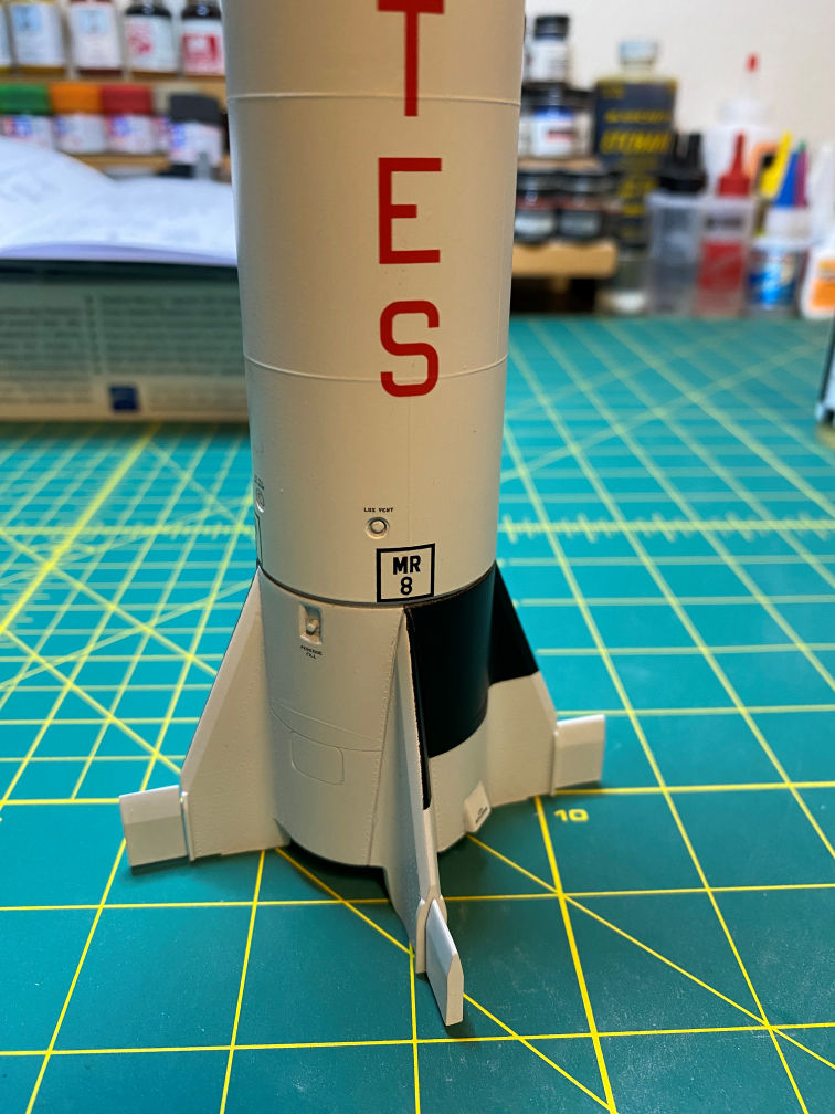 I then glued on the aerodynamic guide fins to the ends of the main fins and started applying the rest of the decals to the Redstone propellant section.