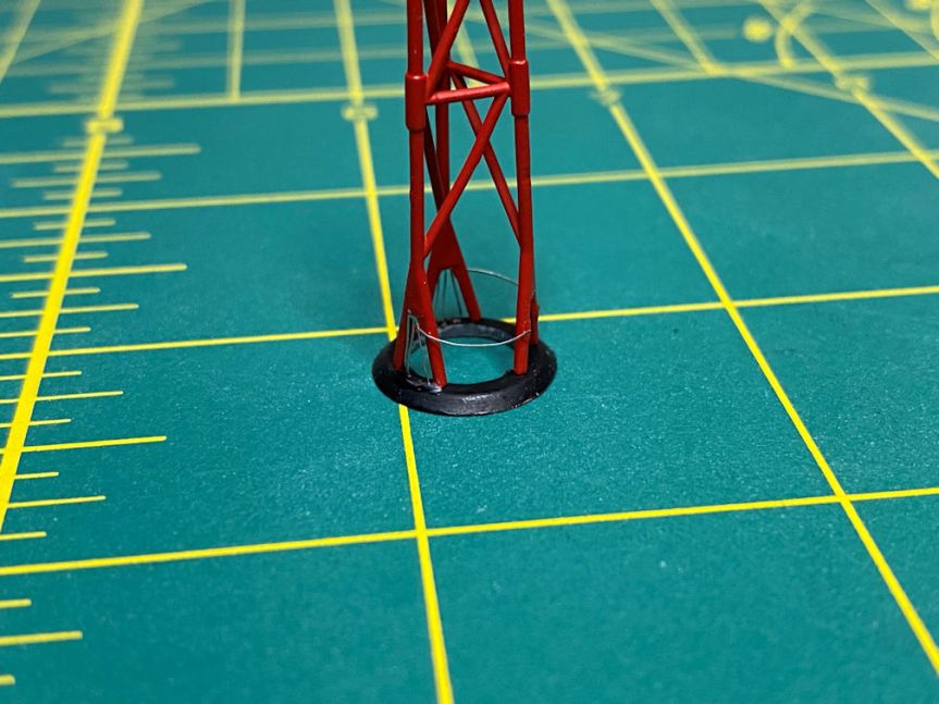 I then painted the bit of PE part that runs from the three individual wires around to one of the tower uprights with the same Vallejo 71.003 Red RLM23 that the rest of the tower is painted. I also touched up a couple of spots on the aerodynamic cover with Vallejo 71.057 Black.