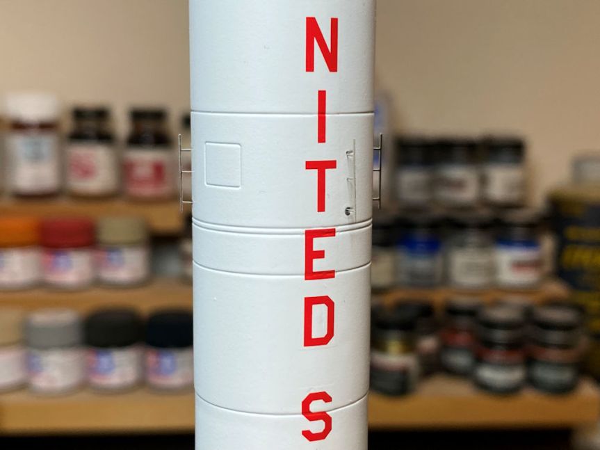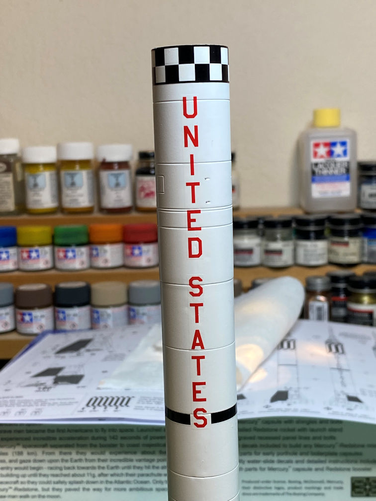 I then started applying decals to the Redstone booster. I started with the checkerboard and United States decals.