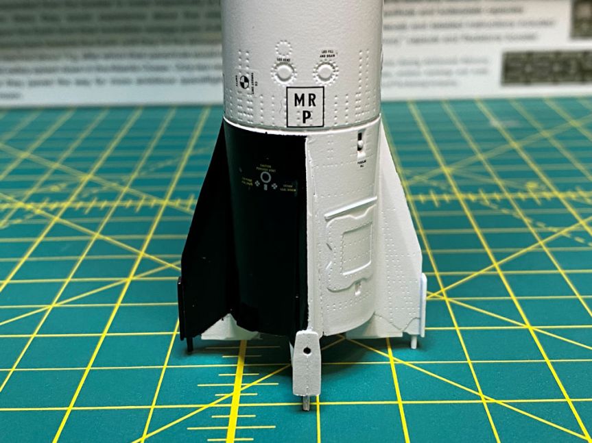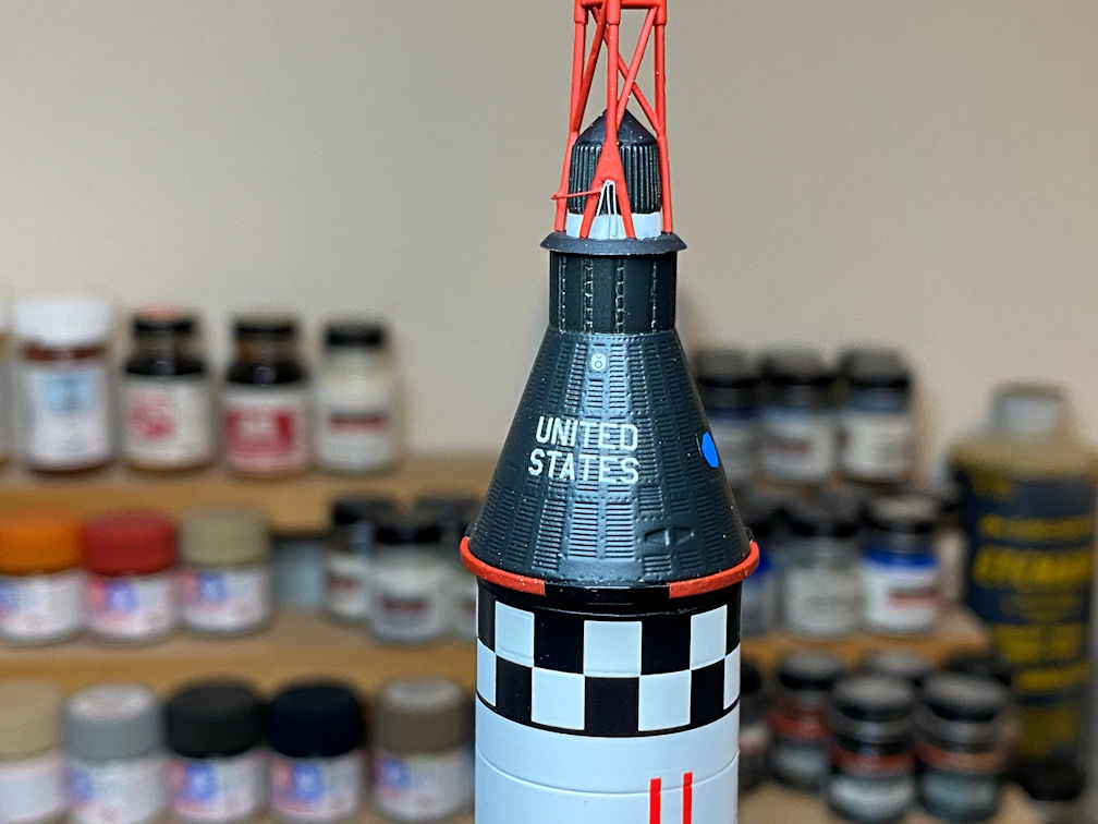Before starting to decal the Redstone booster, I did some more work on the Mercury capsule. I mixed two drops of Vallejo 71.004 Blue and one drop of Vallejo 71.001 White to get a color that will highlight the portholes on the capsule.