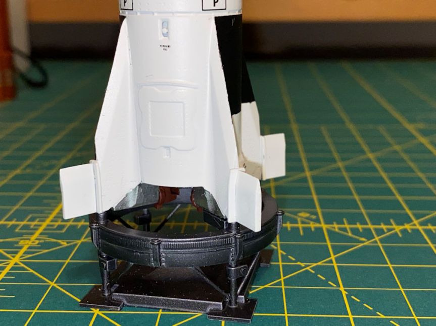 I painted the flame shields at the base of the booster with Vallejo 71.063 Silver RLM01. I also installed the exhaust guide vanes. Here is a photo after placing the booster on the launch stand.