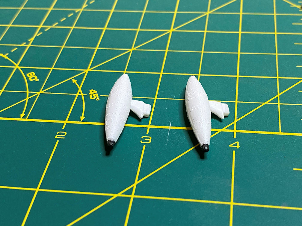 Next up were the details on the Space Cars. The rocket nozzles were painted in Tamiya X-10 Gun Metal. I painted the fin-like protrusions with Tamiya XF-56 Metallic Gray. For the nose I used Vallejo 71.102 Red. The photo shows them on the landing platform but they are not glued in. It was just a convenient place to put them while they dried.