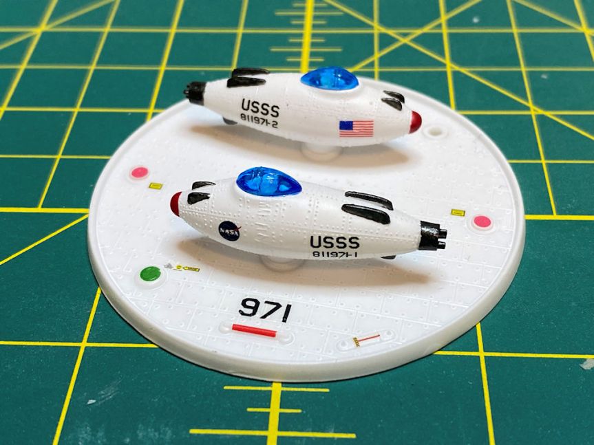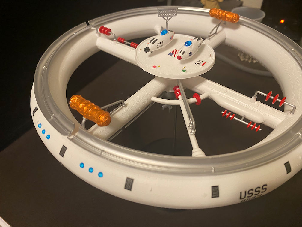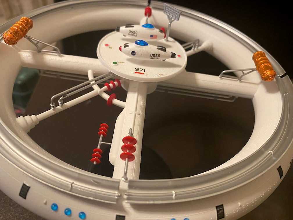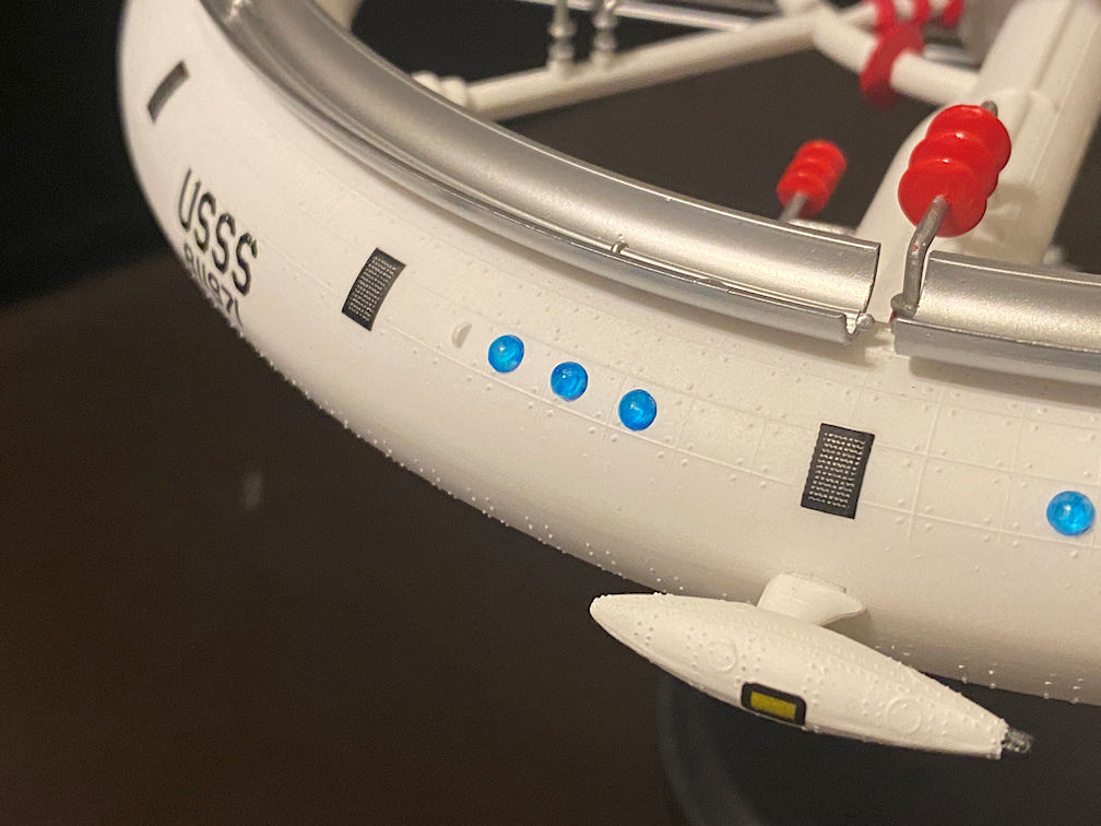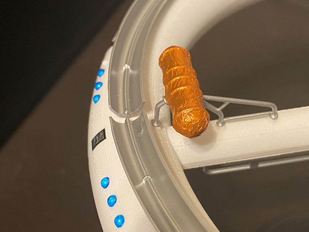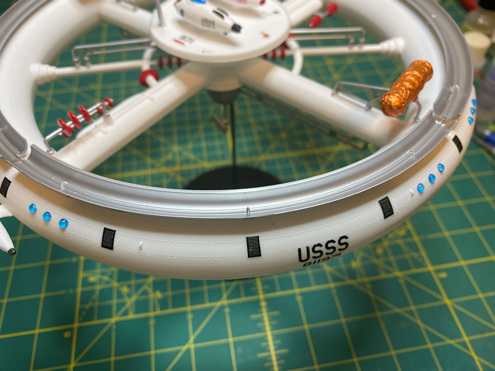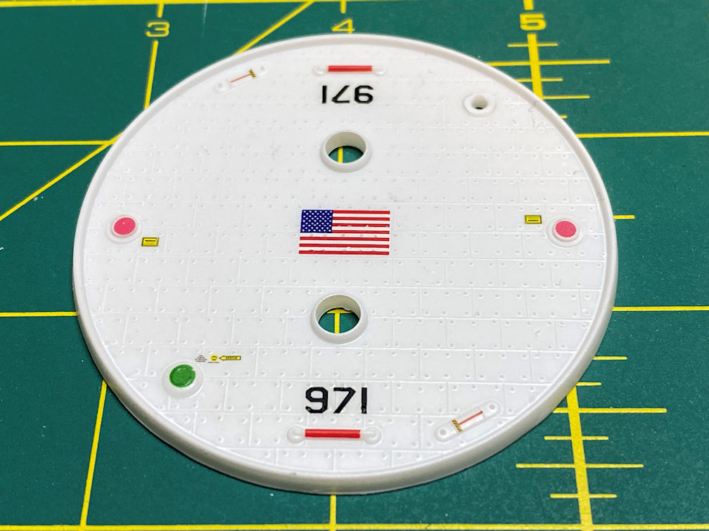 I next applied decals to the bottom of the station ring. First, I carefully sprayed clear gloss on just the main ring. The squares came from a set of decals meant for an Estes Mars Lander rocket. The flags came from the above referenced flag decal sheet.