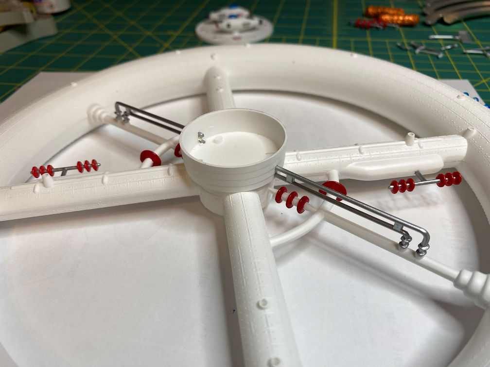 I began by adding the station windows, the station rockets and the upper conduit pipes. The windows really came out great and a nice pop of color.