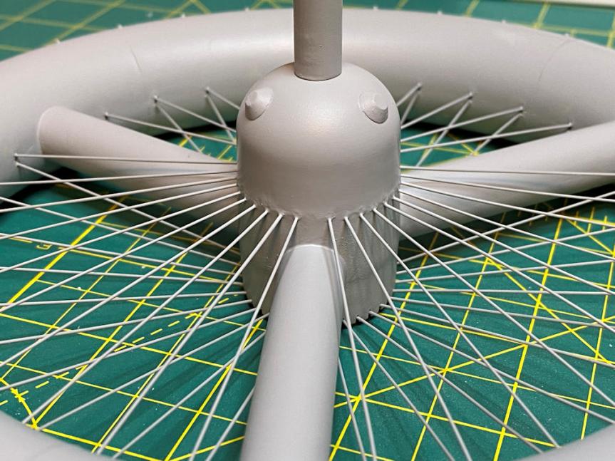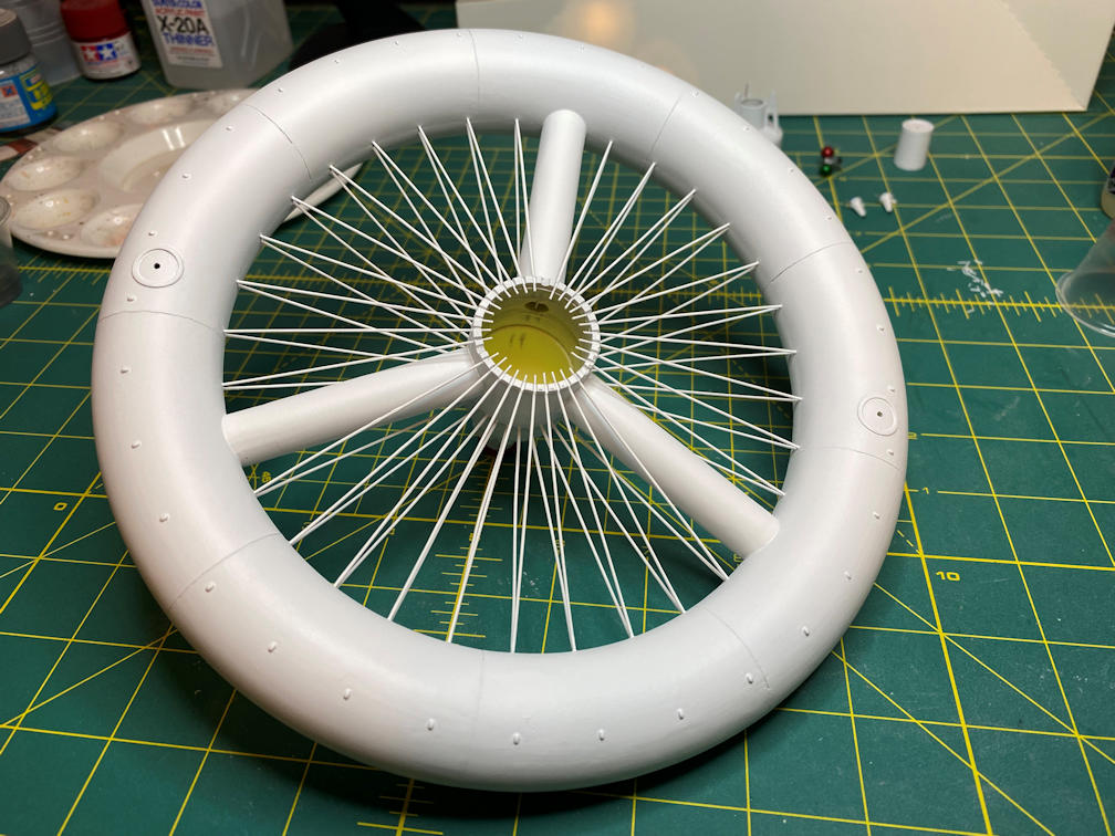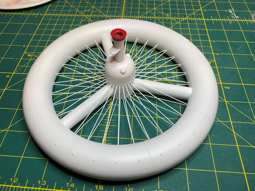 After getting all the spokes on, I glued the lower dome to the core. I then used some gap filling CA to fill the remaining “V” notches where the spokes met both the core and the ring.