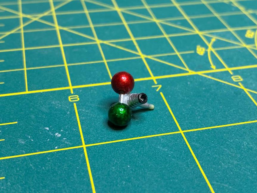 The one of the tanks on the silver thruster module was painted Tamiya X-25 Clear Green and the other Tamiya X-27 Clear Red. I also started drilling out what should be the nozzle end of the thruster module. I started with a very small bit at the center of the part and then gradually enlarged the hole with successively larger bits until I got the size I wanted.