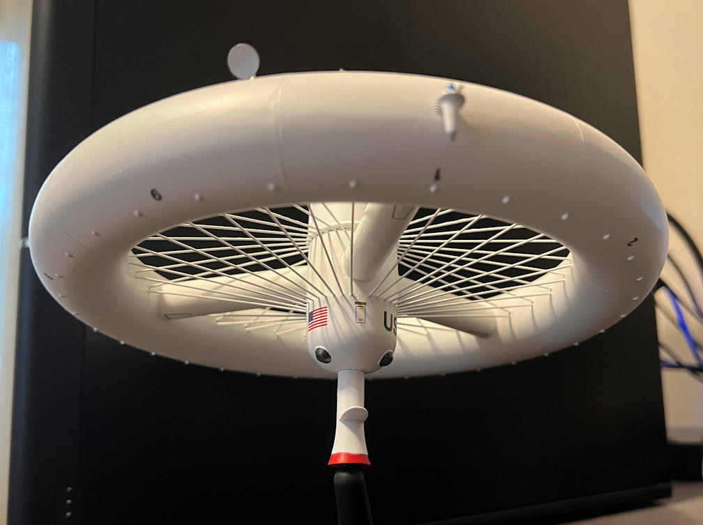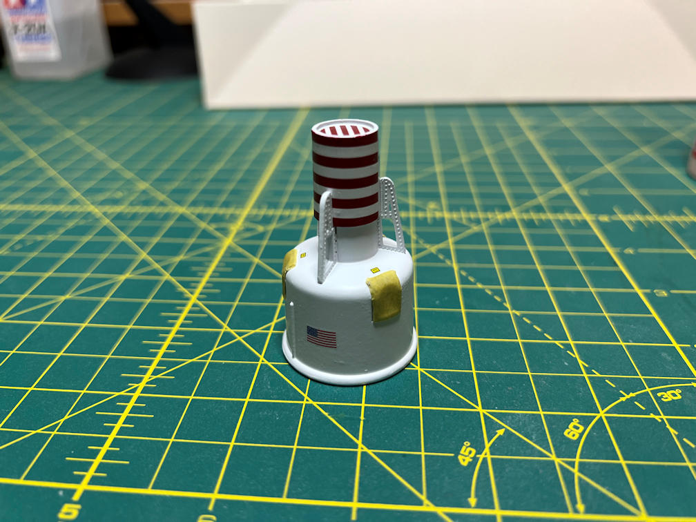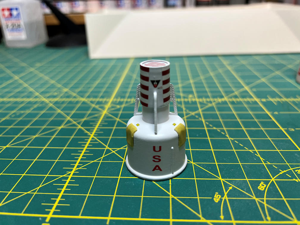 I masked the doors on the upper dome so I could spray a clear coat on to prepare it for decals. I applied the decal to the antenna section and put it on the dome. The antenna section is slightly conical but the decal is not. This caused a few small wrinkles that will be worked on with MicroSol. I added a small warning decal above each door. I also added a USA, flag and NASA decal to put between each door. The decal that runs around the antenna section does not go all the way around. In the gap I put a decal from my BanDai Millennium Falcon decals.