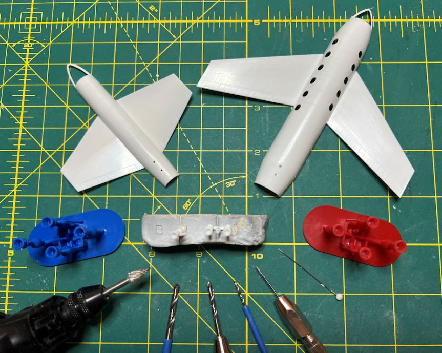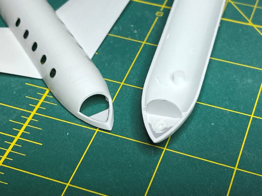 I quickly noticed that all the rocket nozzles are flat on the end. The engine bells are not hollow as they should be. I have drilled out smaller nozzles on other rocket kits, but they were small thrusters. This would require removing quite a bit of plastic and angled sides on the inside of the nozzles.