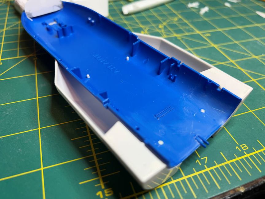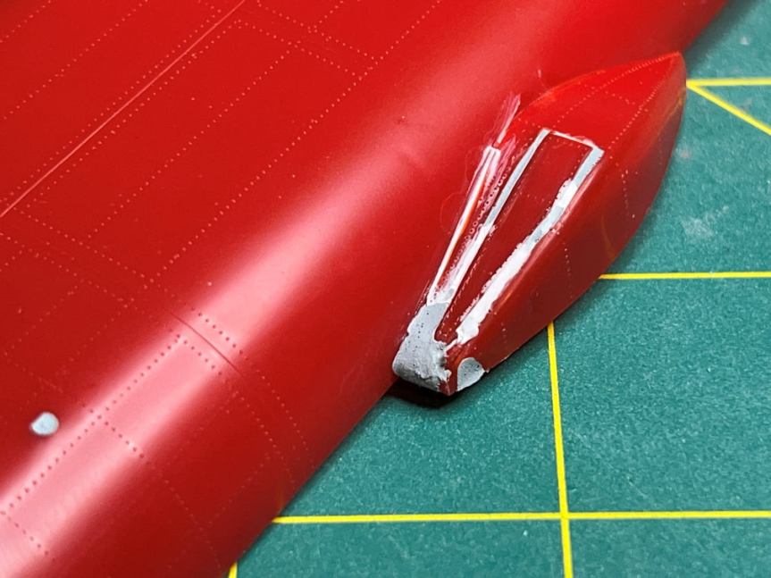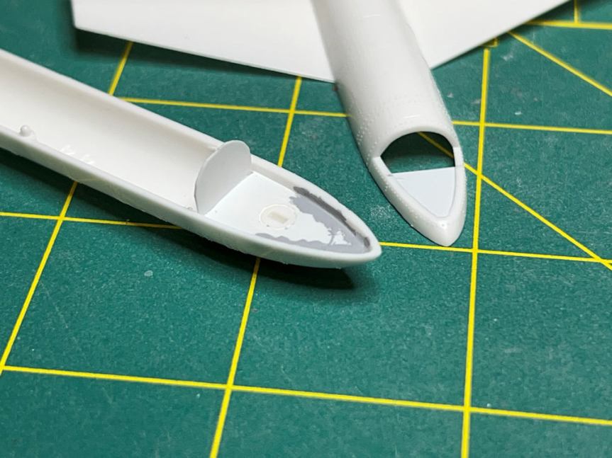 I also did a bit of work on the Orbital Rocket. I dry fitted the drop tanks and trimmed off the excess peg that protrudes into the engine area. This isn’t a problem for the Passenger rocket since it had no drop tanks. But I did need to fill the holes that would have been used to attach them (one of which is visible in the above photo).